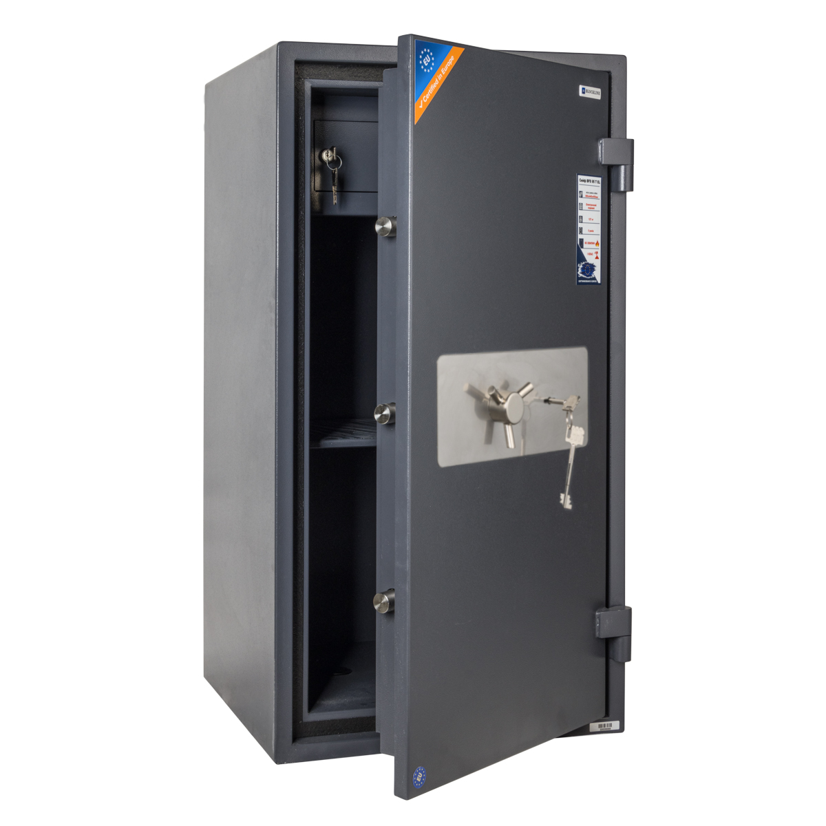 - Сертифіковано в Європі згідно стандартам EN 15659 – LFS 30P (30 хвилин) клас вогнестійкості та EN 1143-1 – І клас зламостійкості;